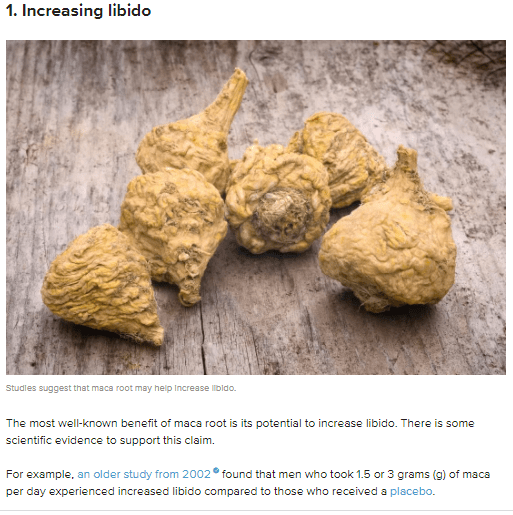 Menurut kajian dari medical news today pada tahun 2002 mendapati lelaki yang mengambil 1.5 atau 3 gram(g) Maca setiap hari akan mengalami peningkatan libido